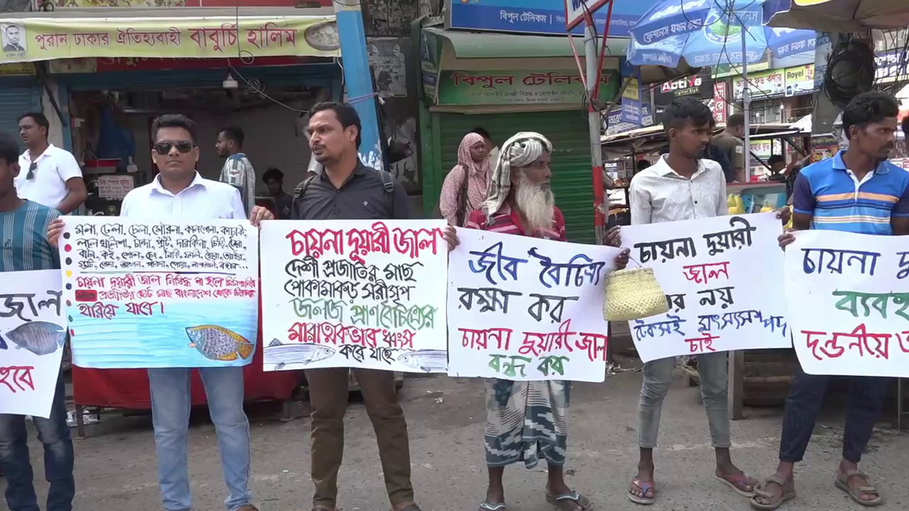 চায়না দুয়ারি জাল দিয়ে মাছ ধরা বন্ধের দাবিতে রাজশাহীতে মানববন্ধন
