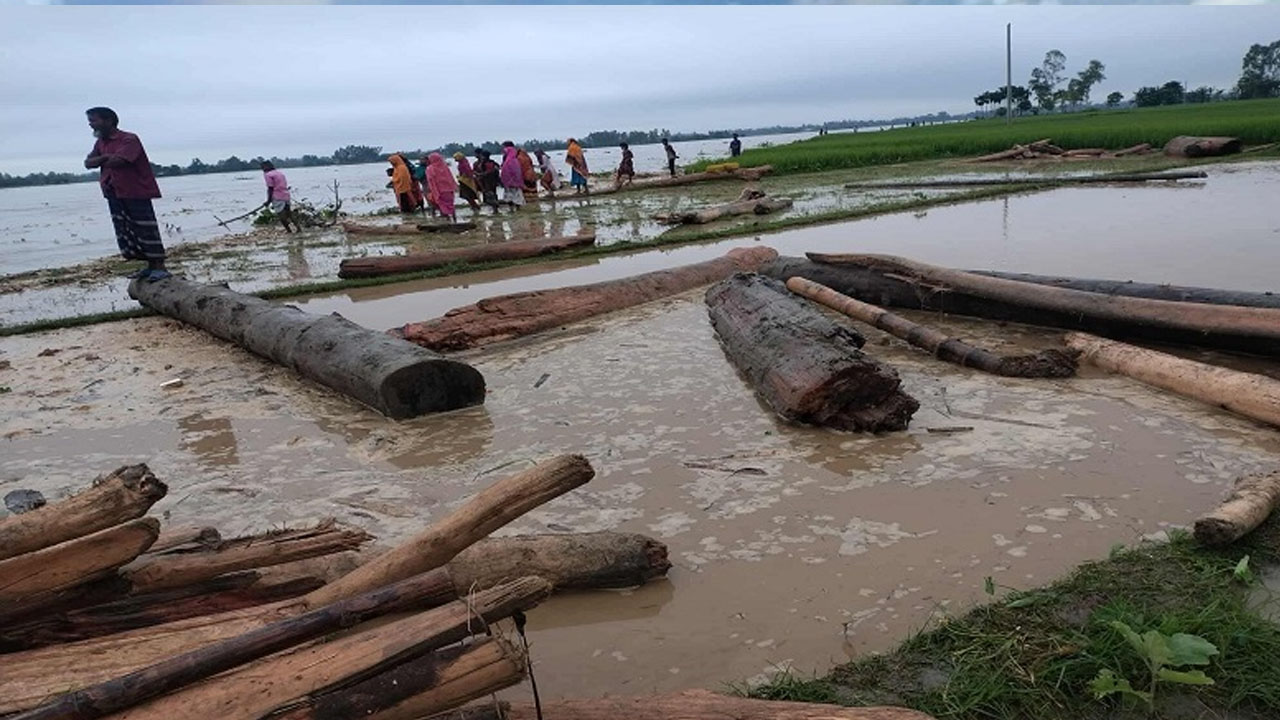 উজান থেকে নদীতে ভেসে আসছে হাজার হাজার গাছের গুঁড়ি