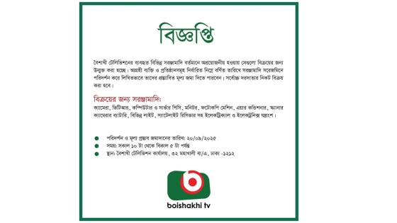 বৈশাখী টেলিভিশনে ব্যবহৃত বিভিন্ন সরঞ্জামাদি বিক্রির বিজ্ঞপ্তি