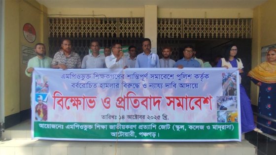 মঙ্গলবার (১৪ অক্টোবর) দুপুরে পঞ্চগড়ের আটোয়ারীতে এ বিক্ষোভ সমাবেশ করেছে উপজেলা শিক্ষক সমিতি।