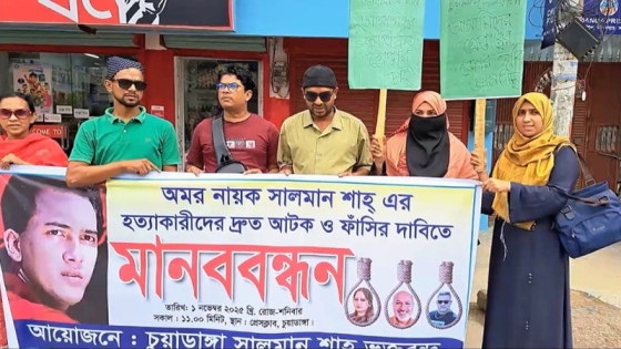 বাংলাদেশের চলচ্চিত্র অঙ্গনের কিংবদন্তি চিত্রনায়ক সালমান শাহ হত্যাকারীদের দ্রুত গ্রেপ্তার ও দৃষ্টান্তমূলক শাস্তির দাবিতে চুয়াডাঙ্গায় মানববন্ধন অনুষ্ঠিত হয়েছে।