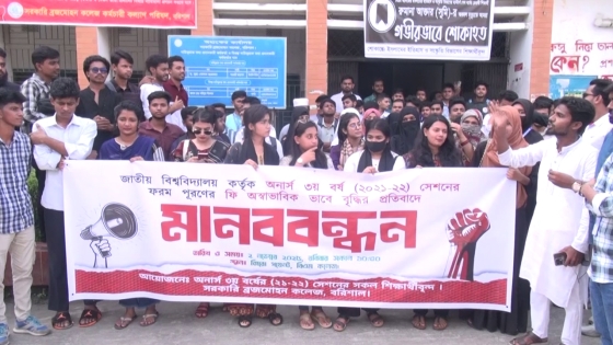 জাতীয় বিশ্ববিদ্যালয় কর্তৃপক্ষ অনার্স তৃতীয় বর্ষ ২০২১-২২ সেশনের ফরম পূরনের ফি অস্বাভাবিকভাবে বাড়ানো হয়েছে। এমন অভিযোগ করে এর প্রতিবাদ জানিয়েছেন বিএম কলেজের শিক্ষার্থীরা। আজ রোববার সকালে কলেজের প্রশাসনিক ভবনের সামনে আয়োজিত এক মানববন্ধন সমাবেশে এ প্রতিবাদ জানা তারা।
