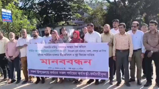 সরকারী দা‌য়িত্ব পালনরত অবস্থায় নিজ অ‌ফি‌সে শেরপু‌রের নকলা কৃ‌ষি অ‌ফিসার শাহ‌রিয়ার মোরসা‌লিন ‌মে‌হে‌দির উপর দূর্বৃত্তের শা‌রিরীক হামলার তীব্র প্রতিবা‌দ ও সুষ্ঠ বিচা‌রের দাবী‌তে মানববন্ধন ক‌রে‌ছে নকলা উপ‌জেলায় কর্মরত সকল কর্মকর্তা কর্মচারীবৃন্দ ।